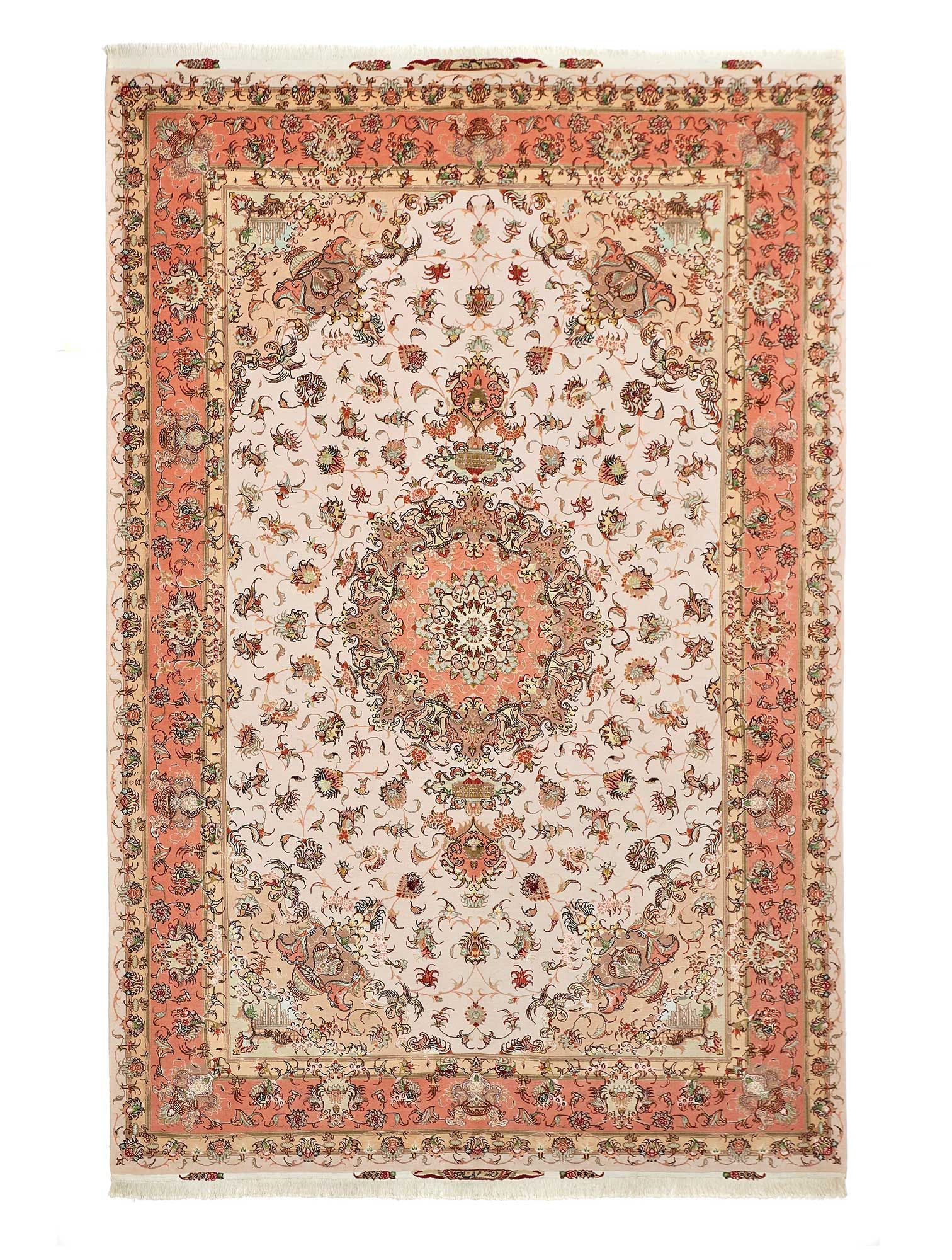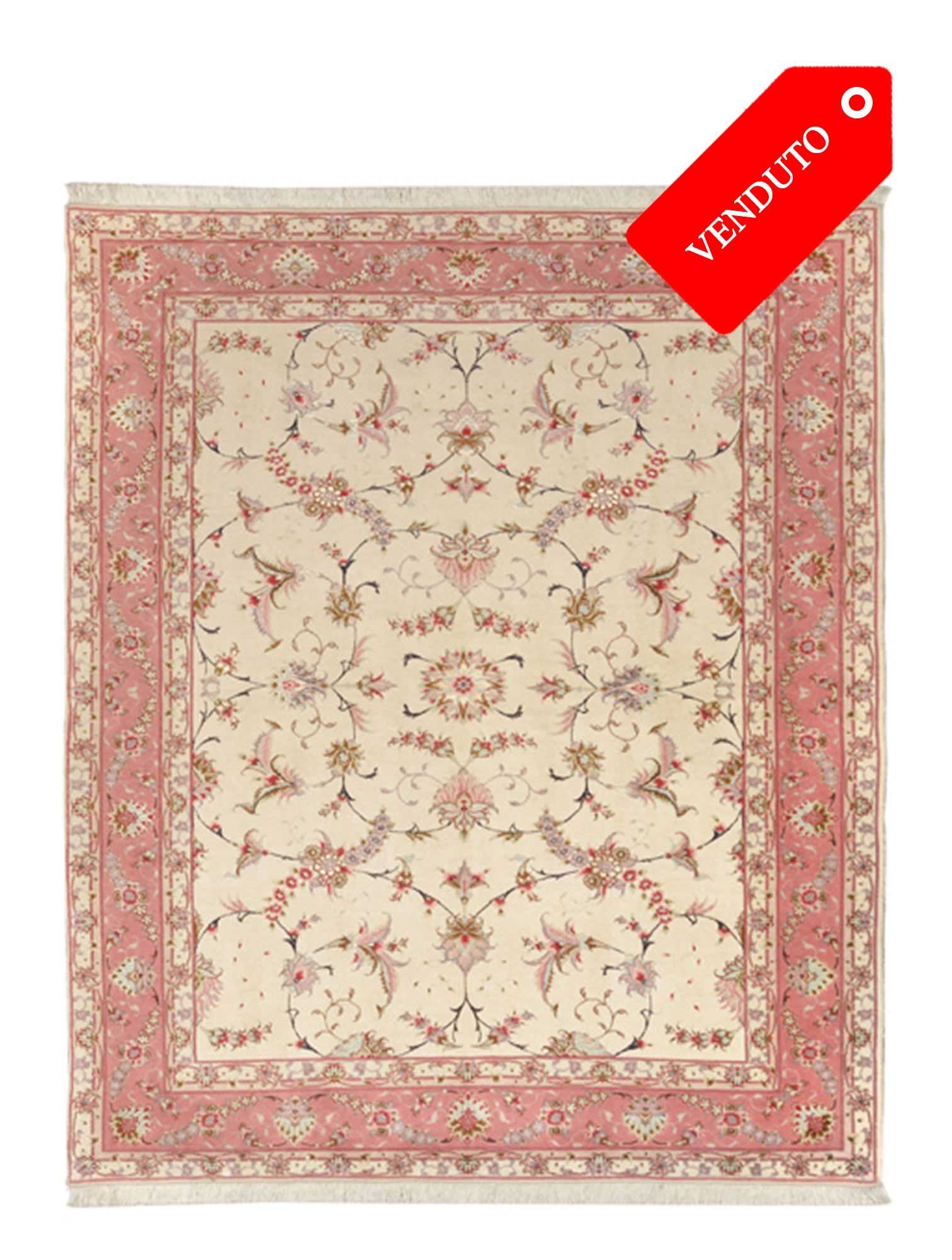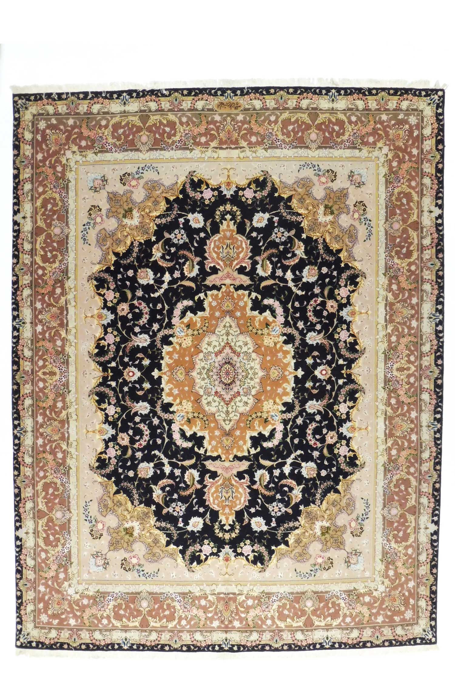Annodato nella città di Tabriz, situata nella parte nord-occidentale dell'Iran è tra i più noti e pregiati nell'arte persiana persiana e la firma aggiunge valore e autenticità all'opera, spesso attribuendo il tappeto a un maestro tessitore o a un atelier prestigioso. La trama in seta dona notevole morbidezza e un punto di nodo che rende il disegno più dettagliato.