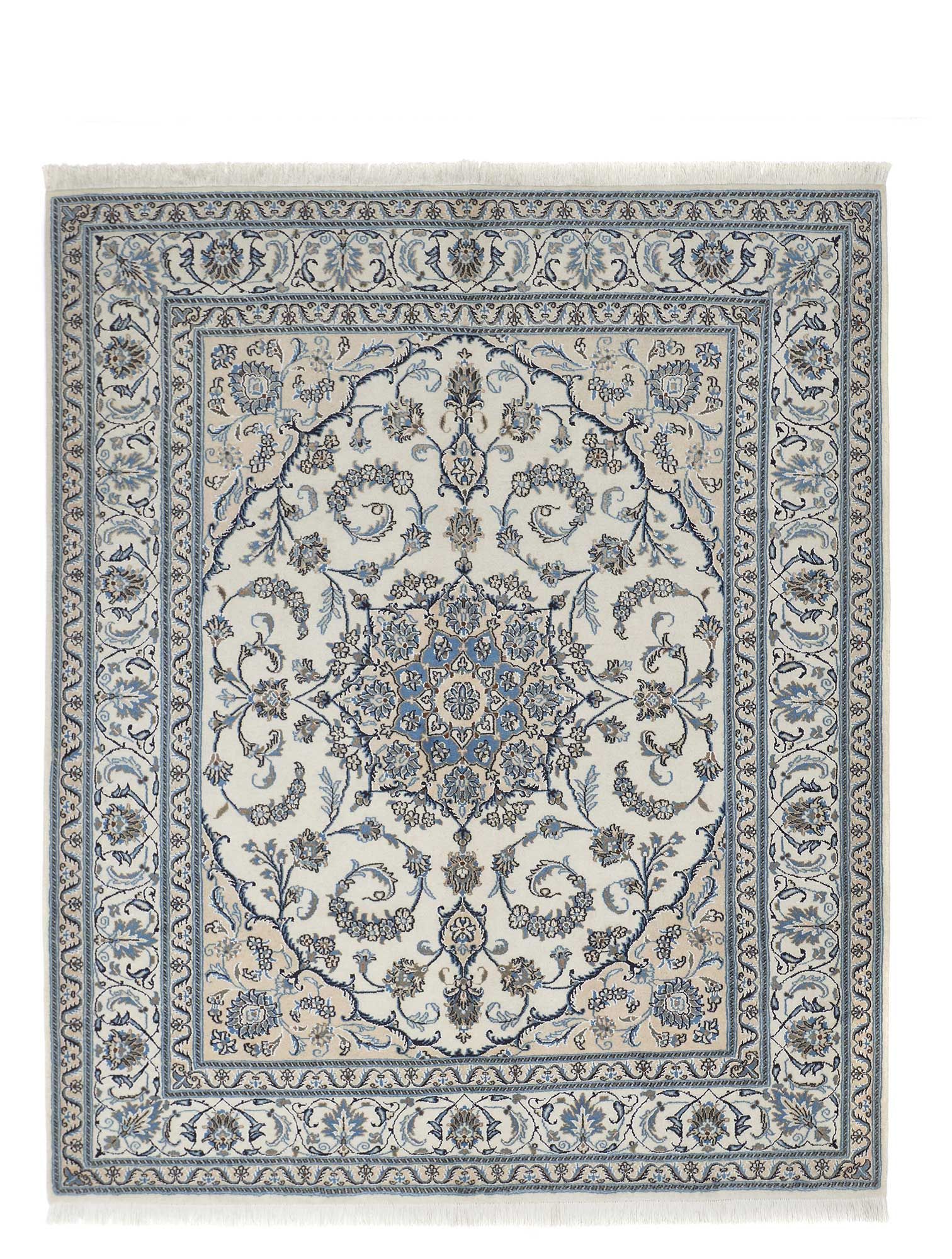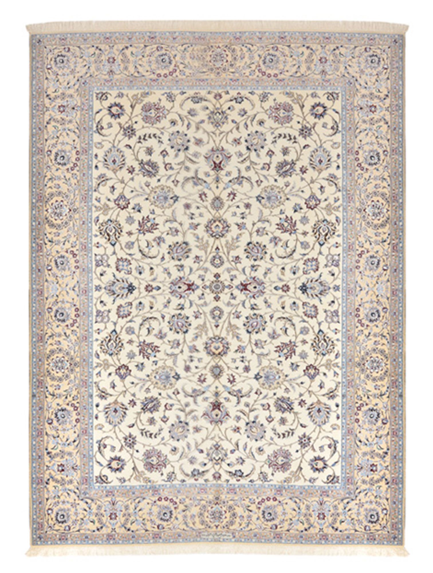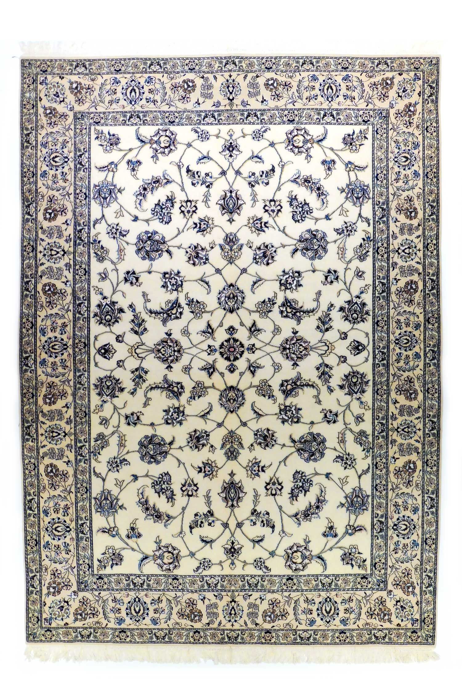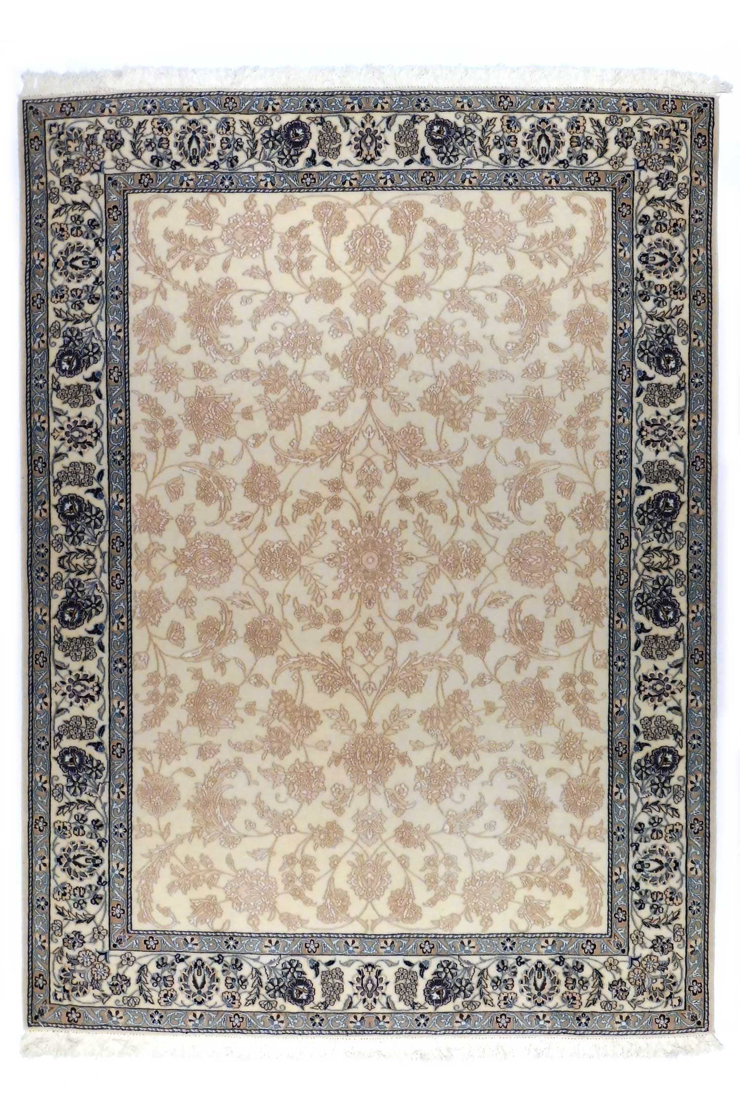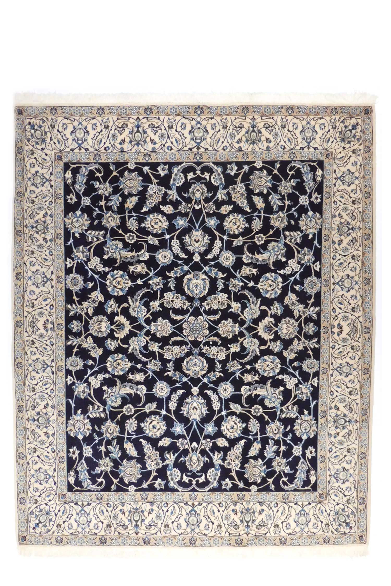 Questo tappeto proviene dalla città di Nain, situata vicino a Isfahan, in Iran. Nain è celebre per la produzione di tappeti di altissima qualità. . Il colore di fondo è un azzurro profondo, creando un contrasto sofisticato con i motivi in avorio, beige. Le dimensioni rettangolari rendono questo tappeto ideale per grandi spazi, come salotti, sale da pranzo o camere da letto principali.