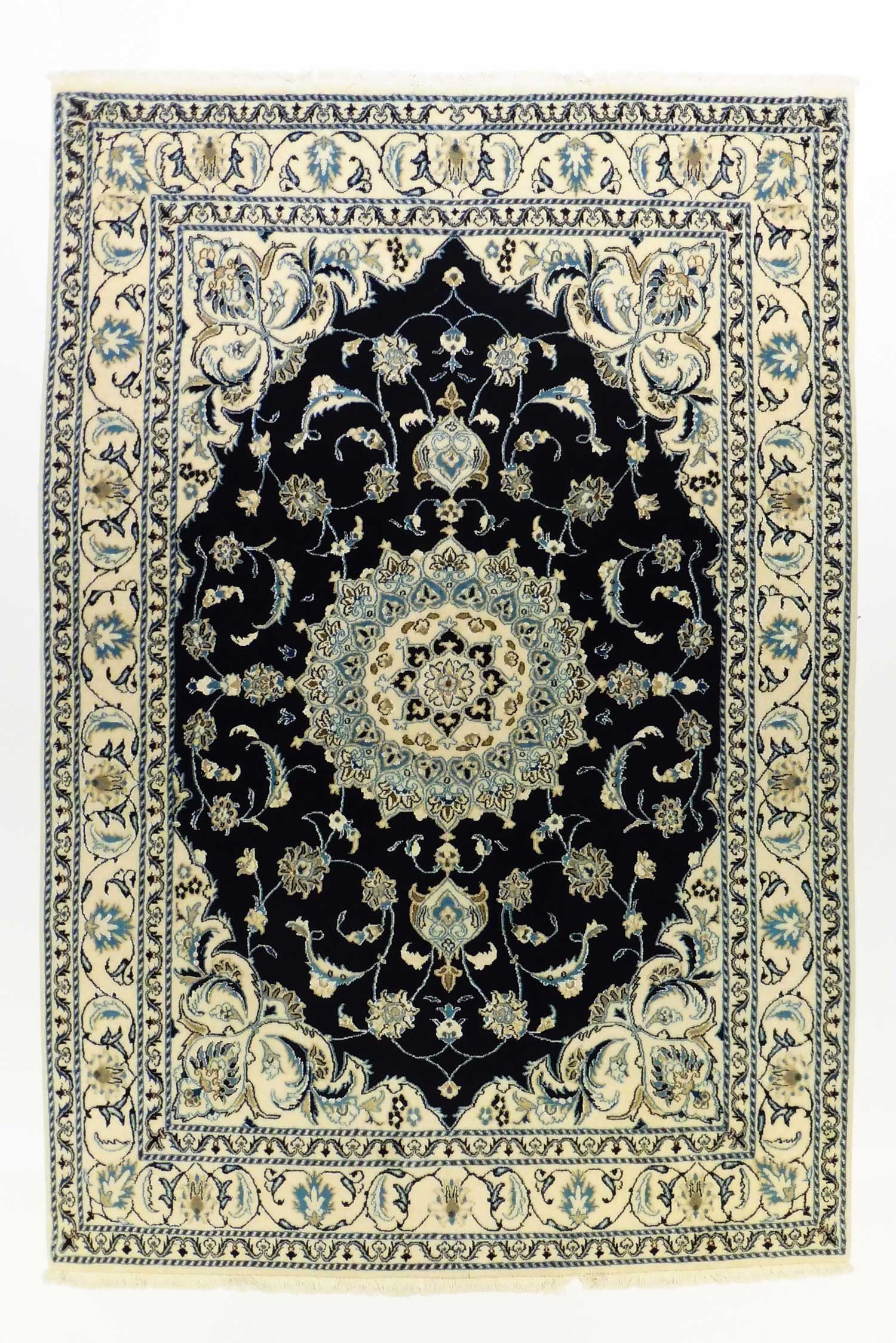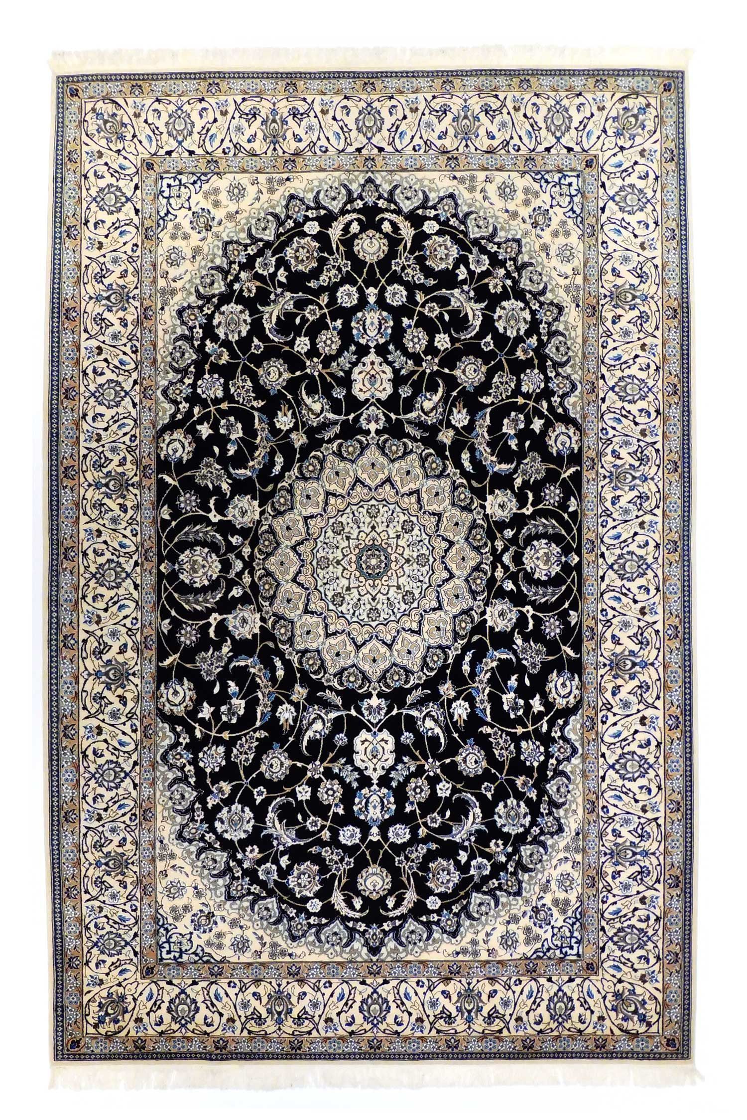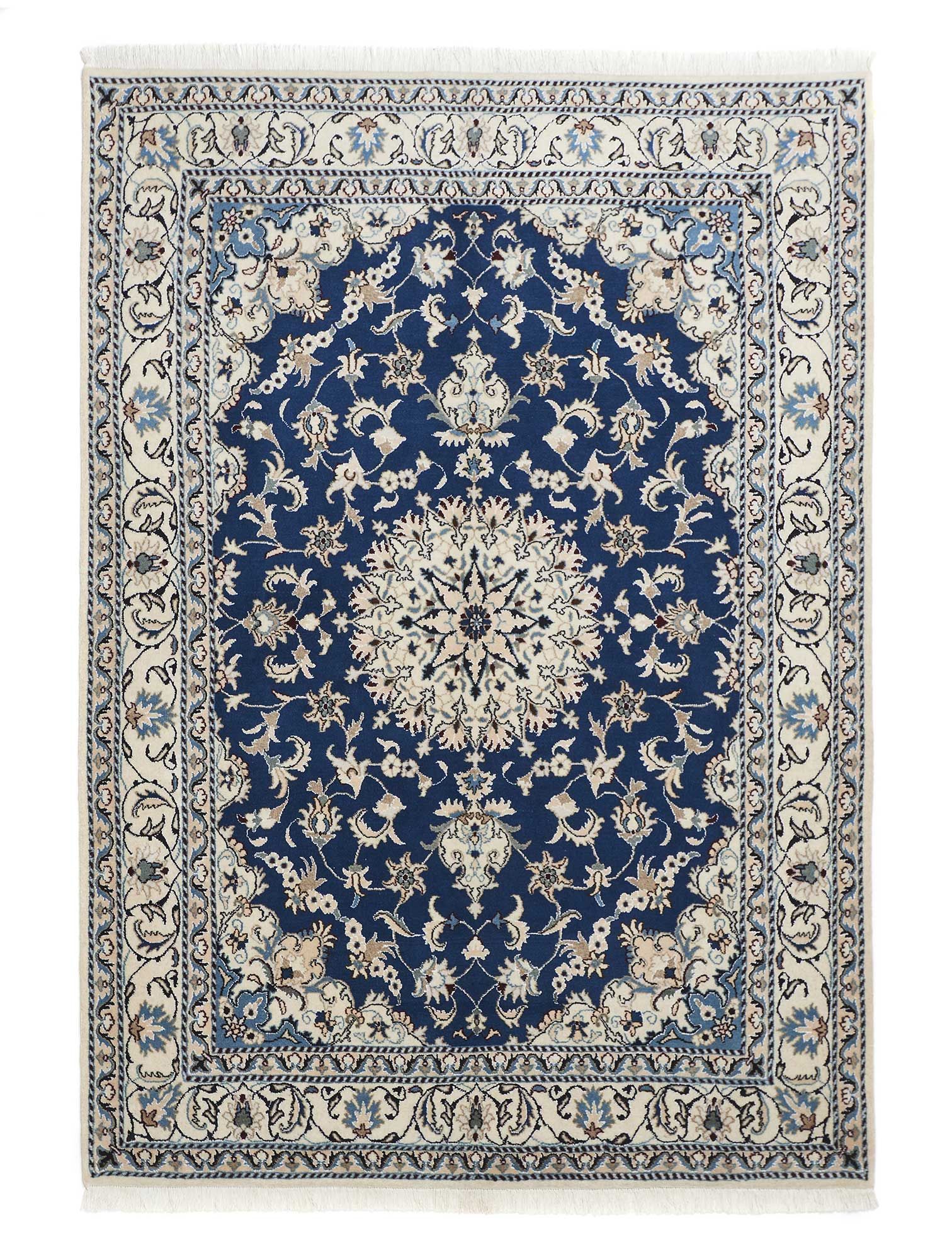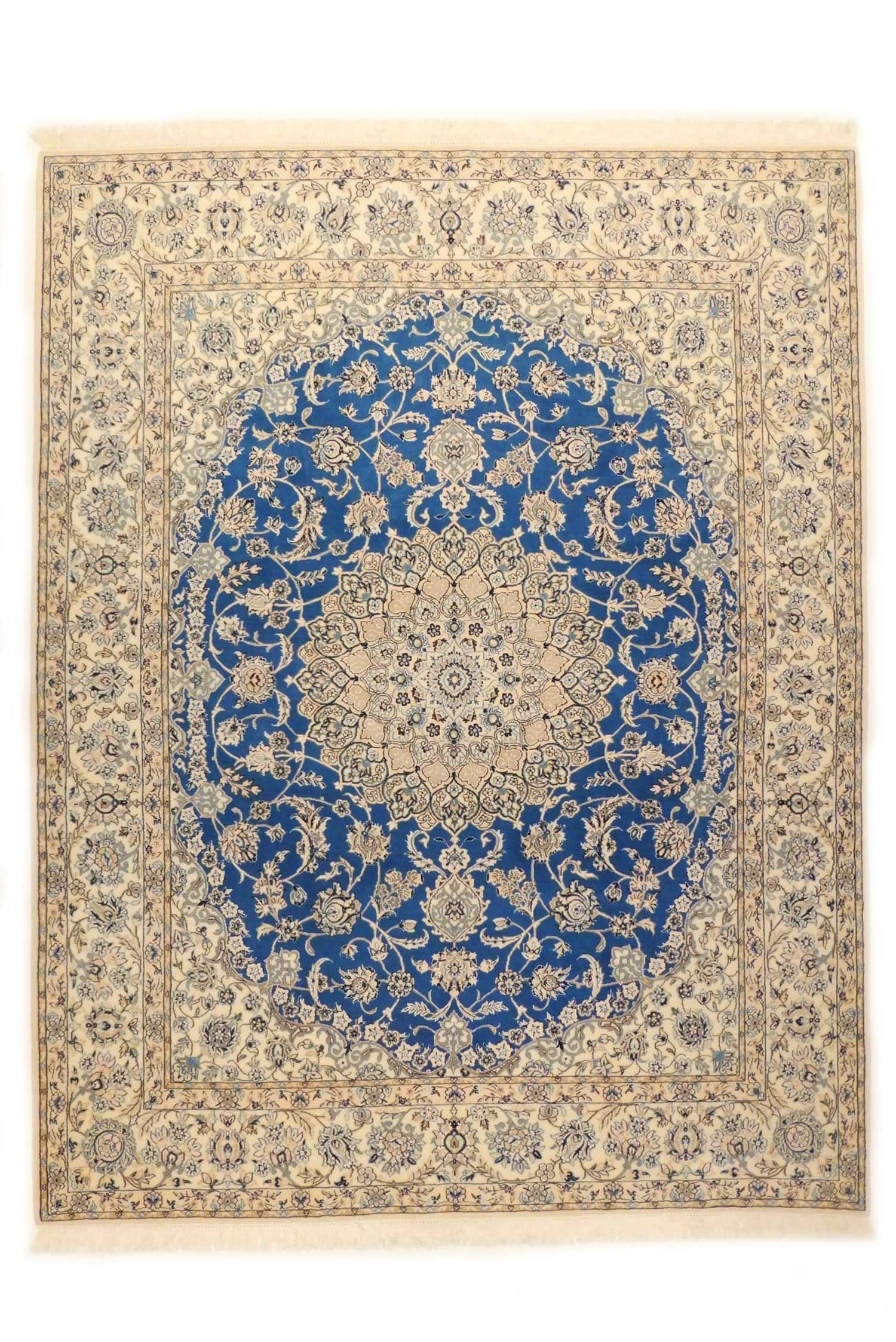 Il Nain è uno dei più rinomati e apprezzati tappeti persiani, noto per la sua eccezionale qualità, dettagli intricati e l'eleganza del design. Il termine "9 line" indica la densità dei nodi del tappeto che consente un buon livello di dettaglio nei disegni. Il colore di fondo blu dona estrema eleganza al manufatto.
