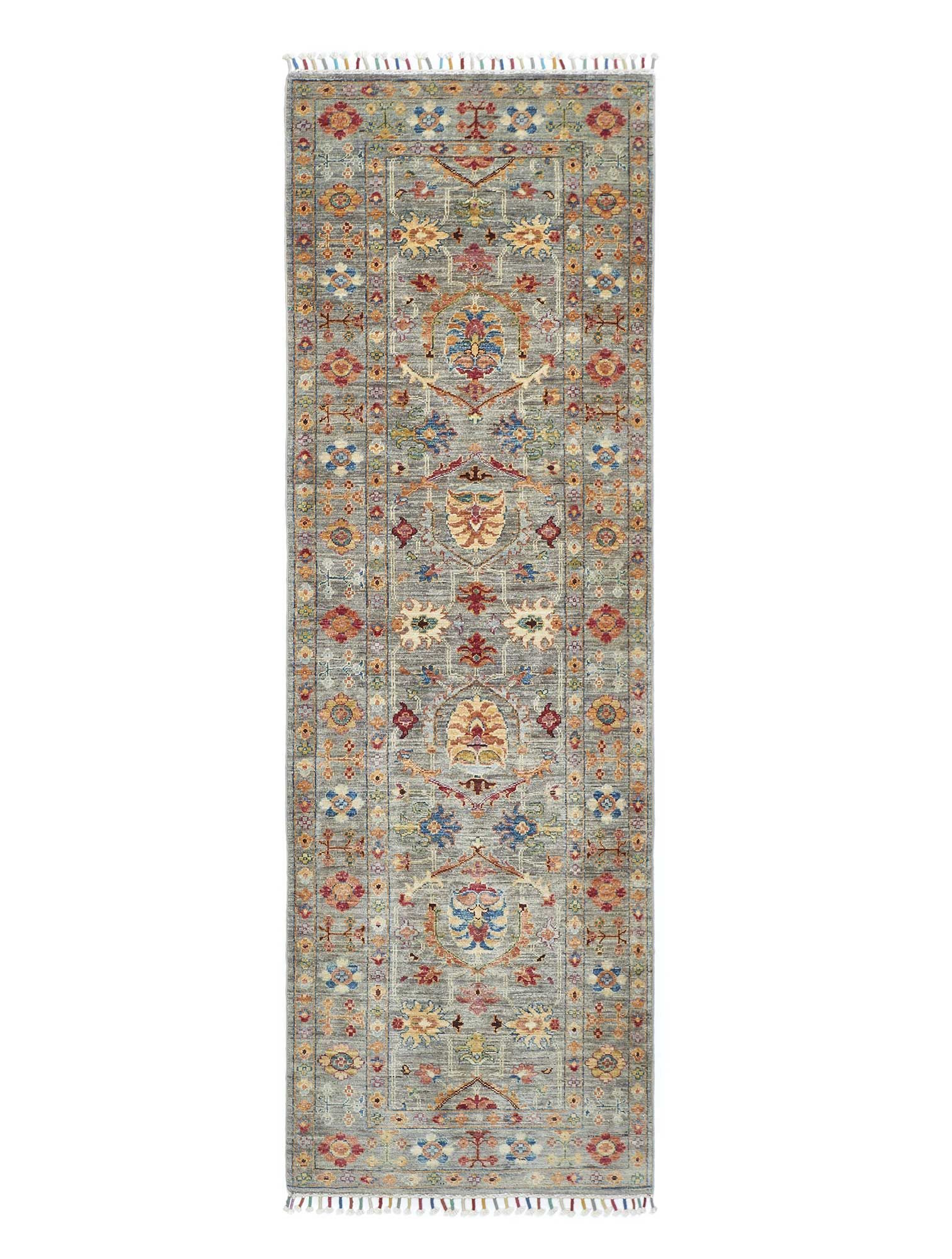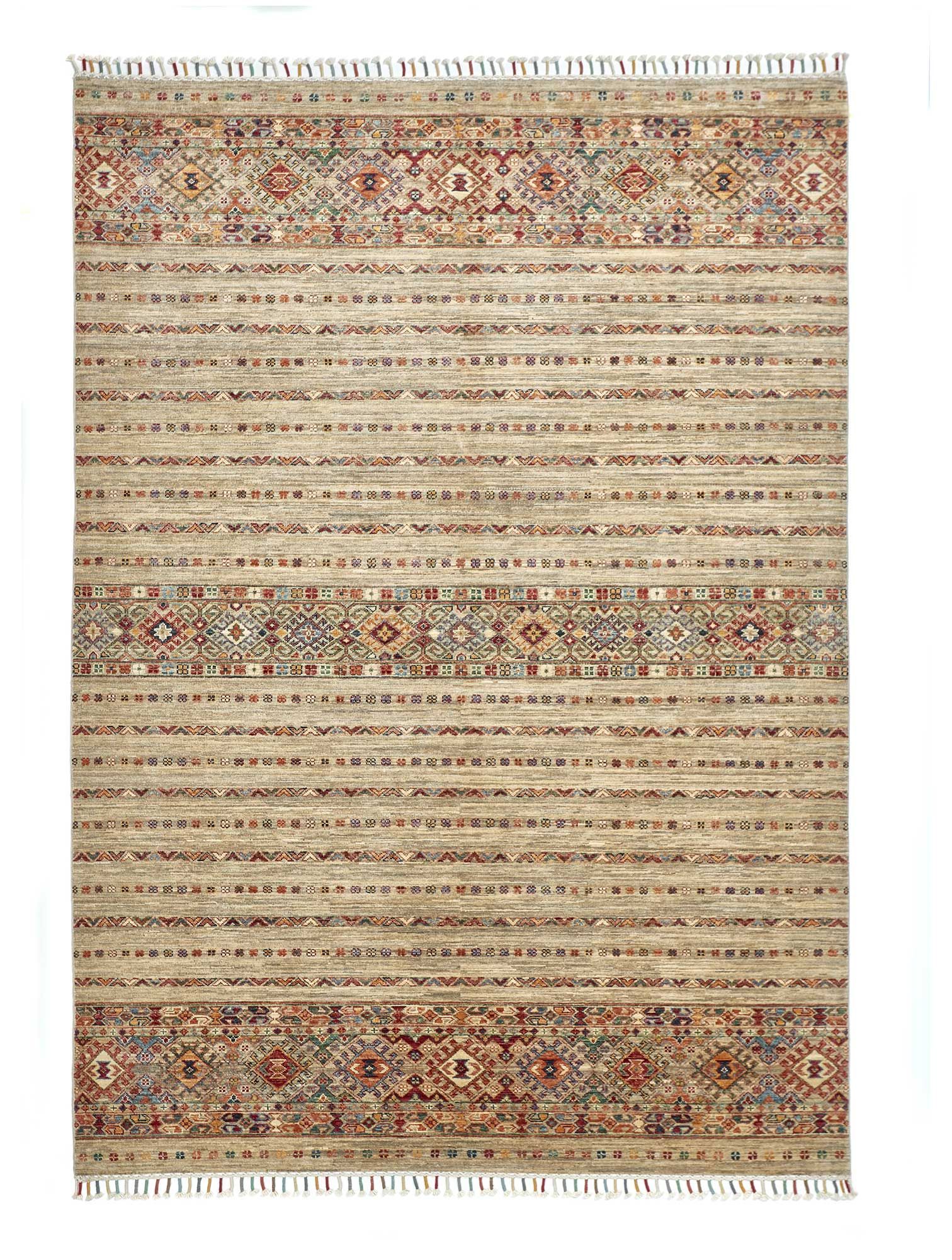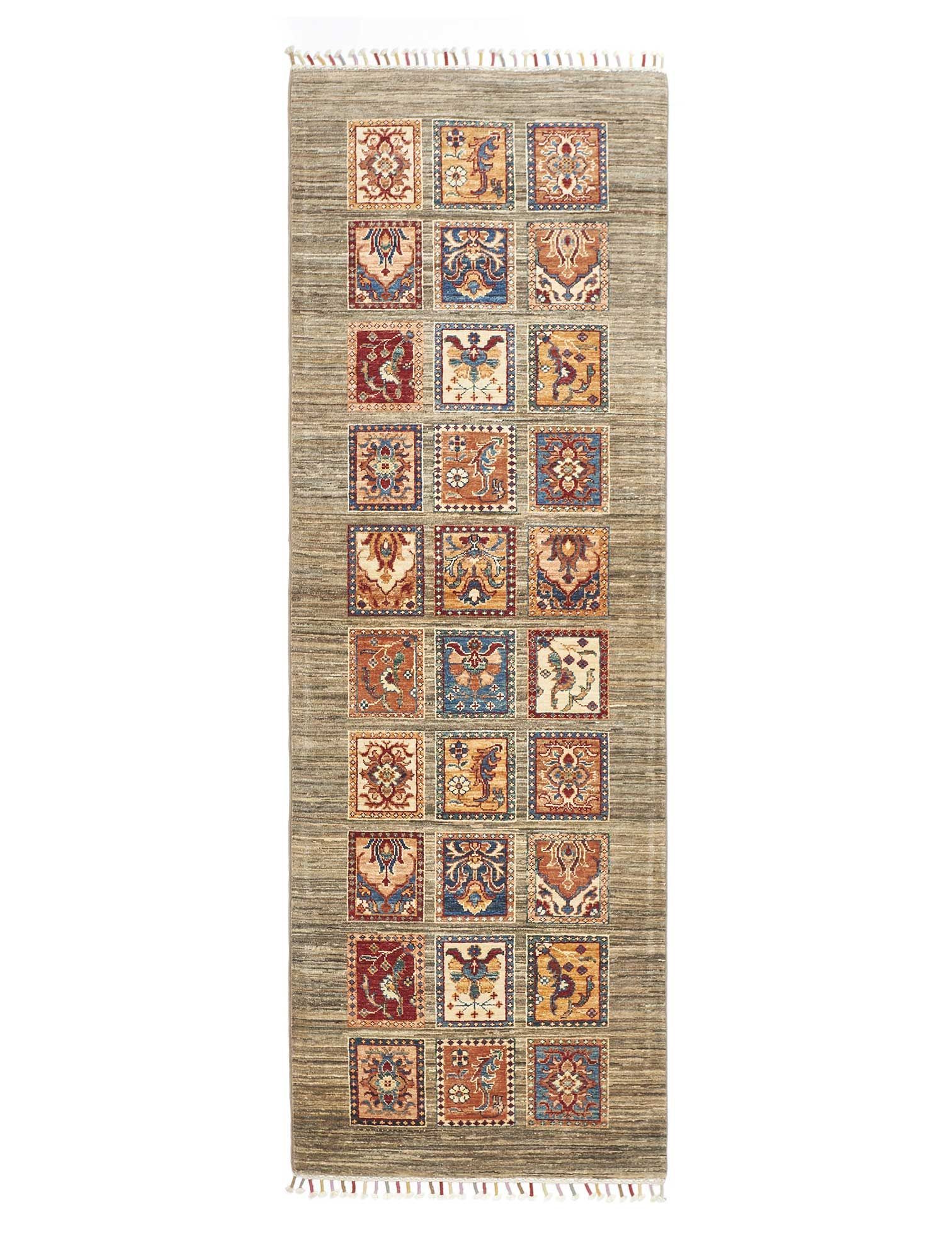 Manifattura artigianale afgana completamente in lana, particolarizzata dal fatto che sono le donne a seguirne la realizzazione, scegliendo le lane, l’uso dei colori e le fantasie nell’impianto di disegno.