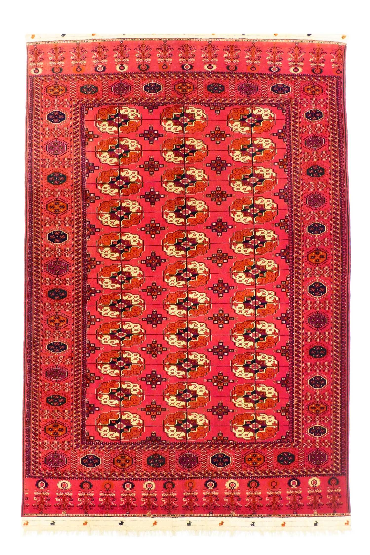Il tappeto Bukhara è originario della regione dell'Asia centrale, in particolare dall'area intorno alla città di Bukhara, che si trova nell'attuale Uzbekistan. Il motivo principale è il "gul", una forma geometrica o stilizzata ripetuta in modo regolare su tutto il tappeto. La lana è il materiale principale utilizzato per la realizzazione di questi tappeti, sia per il vello che per l'ordito e la trama. Sono molto ricercati dai collezionisti di tappeti orientali per il loro valore storico e artistico
