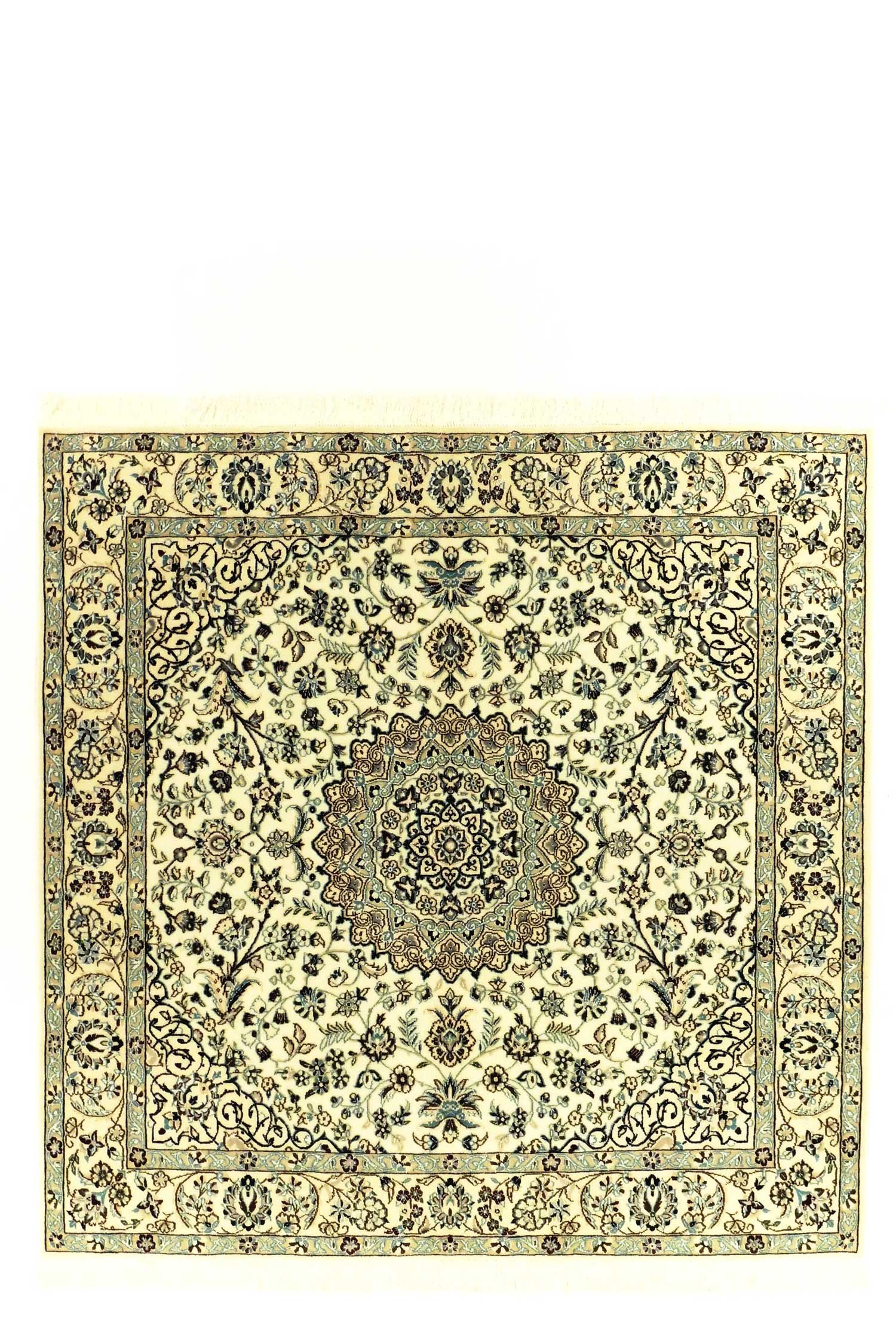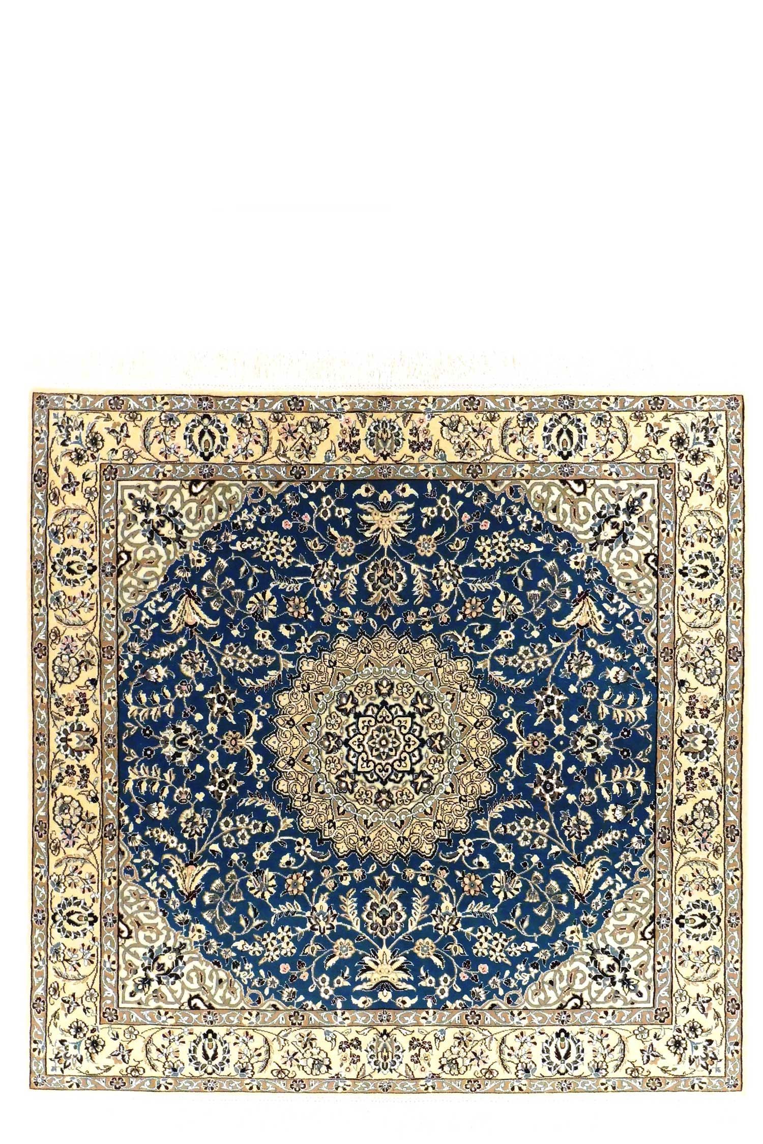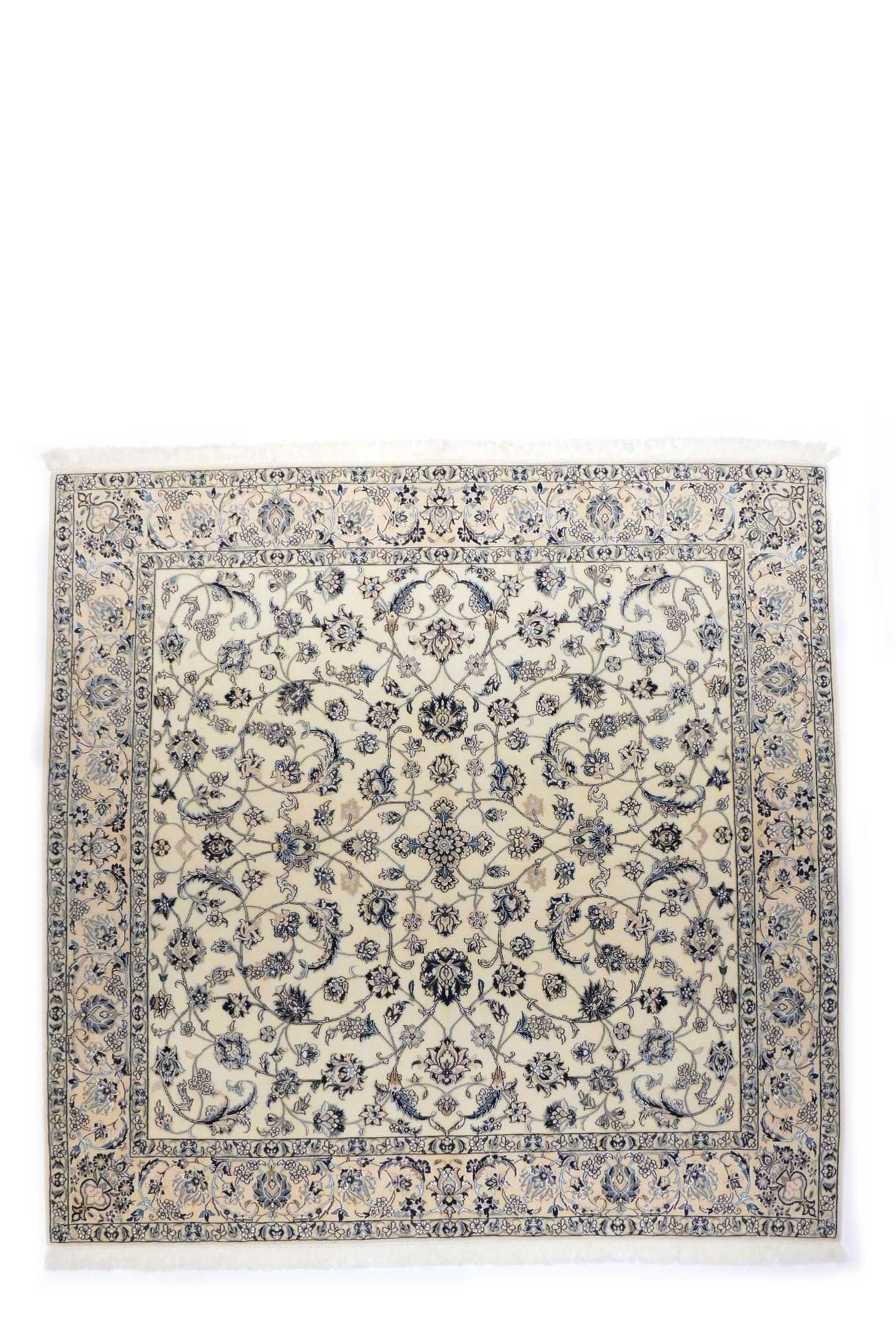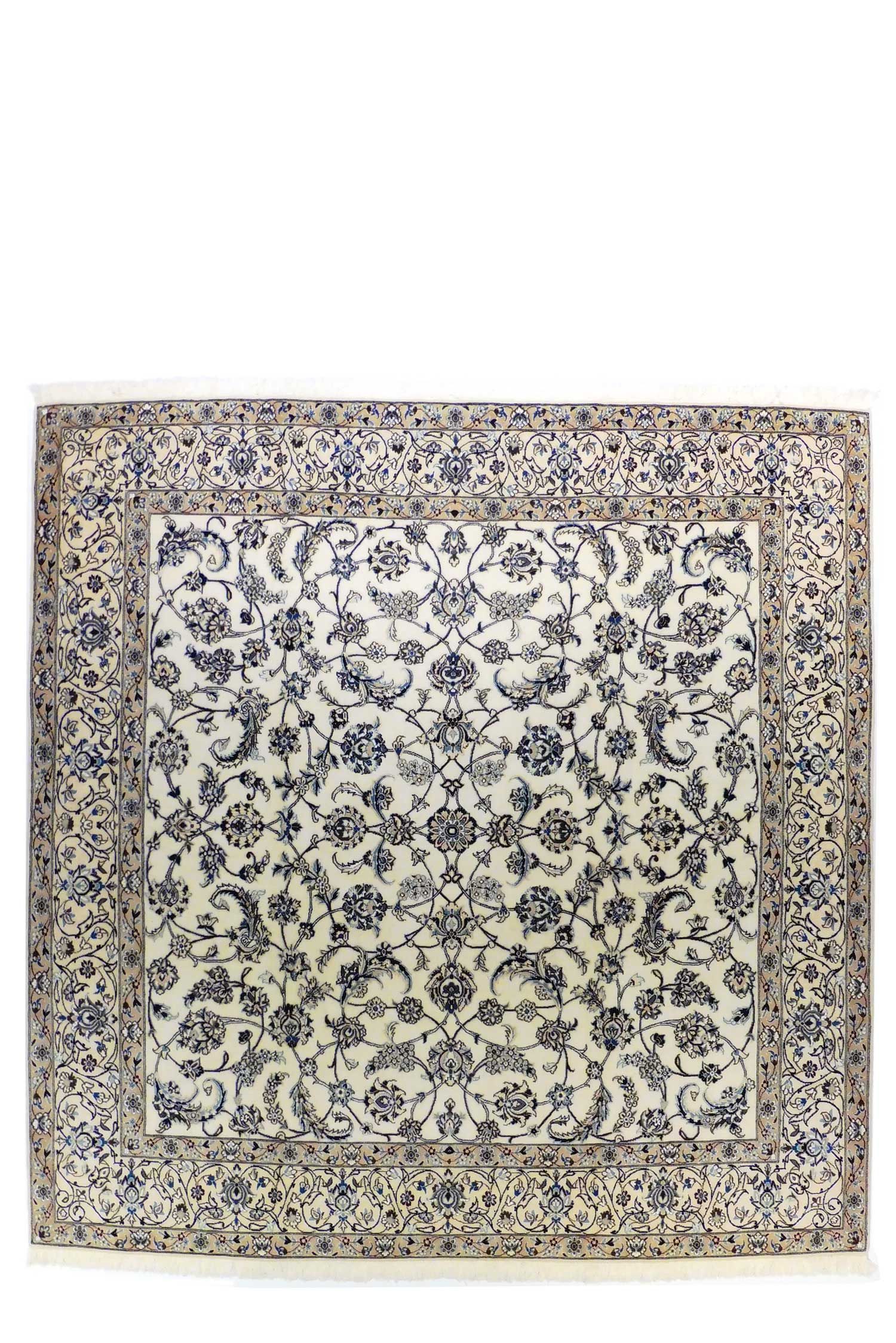 Questo tappeto di Nain rappresenta l'eccellenza dell'artigianato tessile persiano, famoso per la sua qualità superiore, i materiali pregiati e i disegni intricati. Questo tipo di tappeto è ideale per ambienti eleganti e sofisticati, aggiungendo un tocco di classe e raffinatezza. Le dimensioni quadrate di questo tappeto lo rendono adatto per grandi ambienti, come soggiorni, sale da pranzo o camere da letto principali, creando un punto focale armonioso