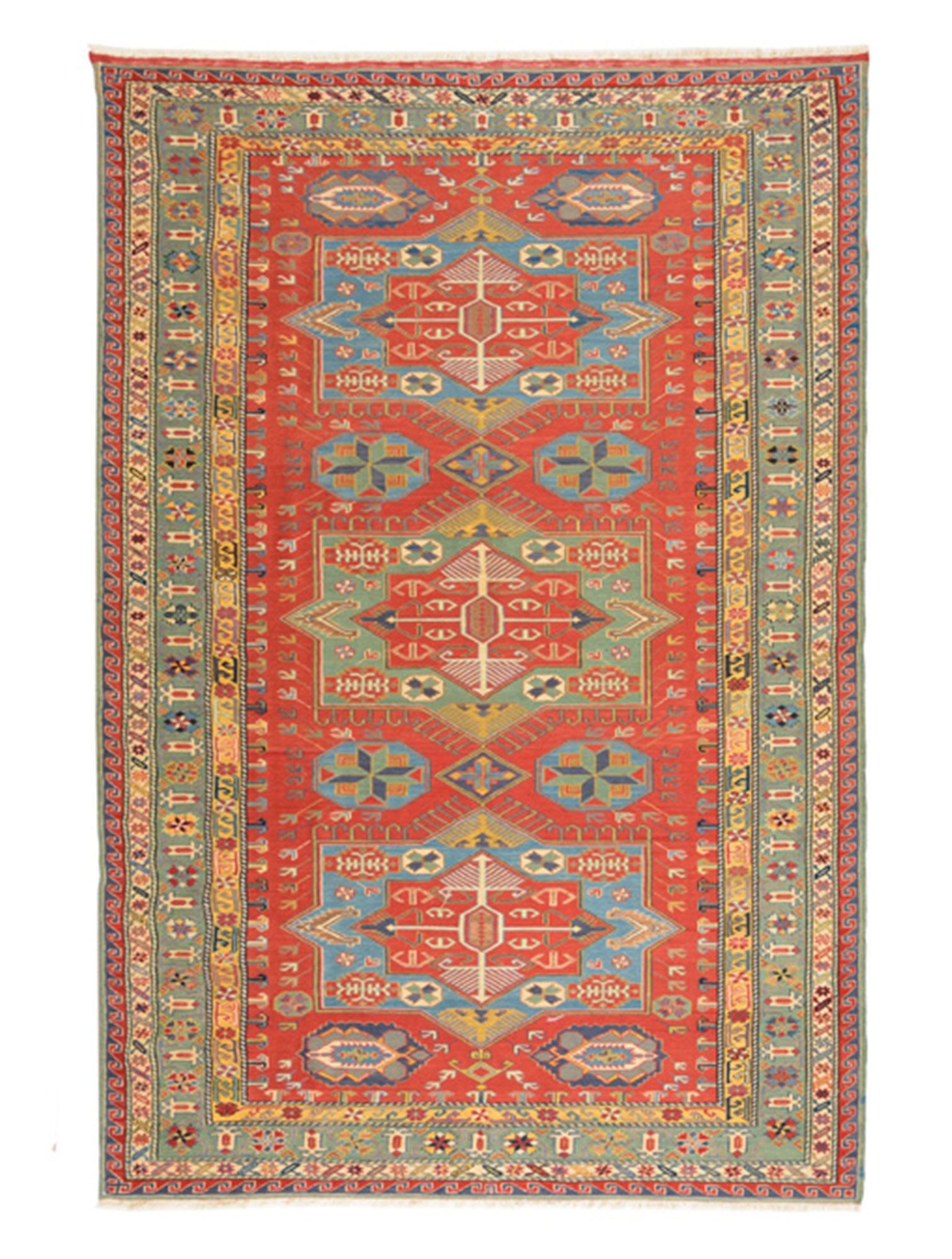 L’influenza caucasica è forte in questo esemplare di manifattura recente, caratterizzato da un impianto a cassettoni e una vivida colorazione