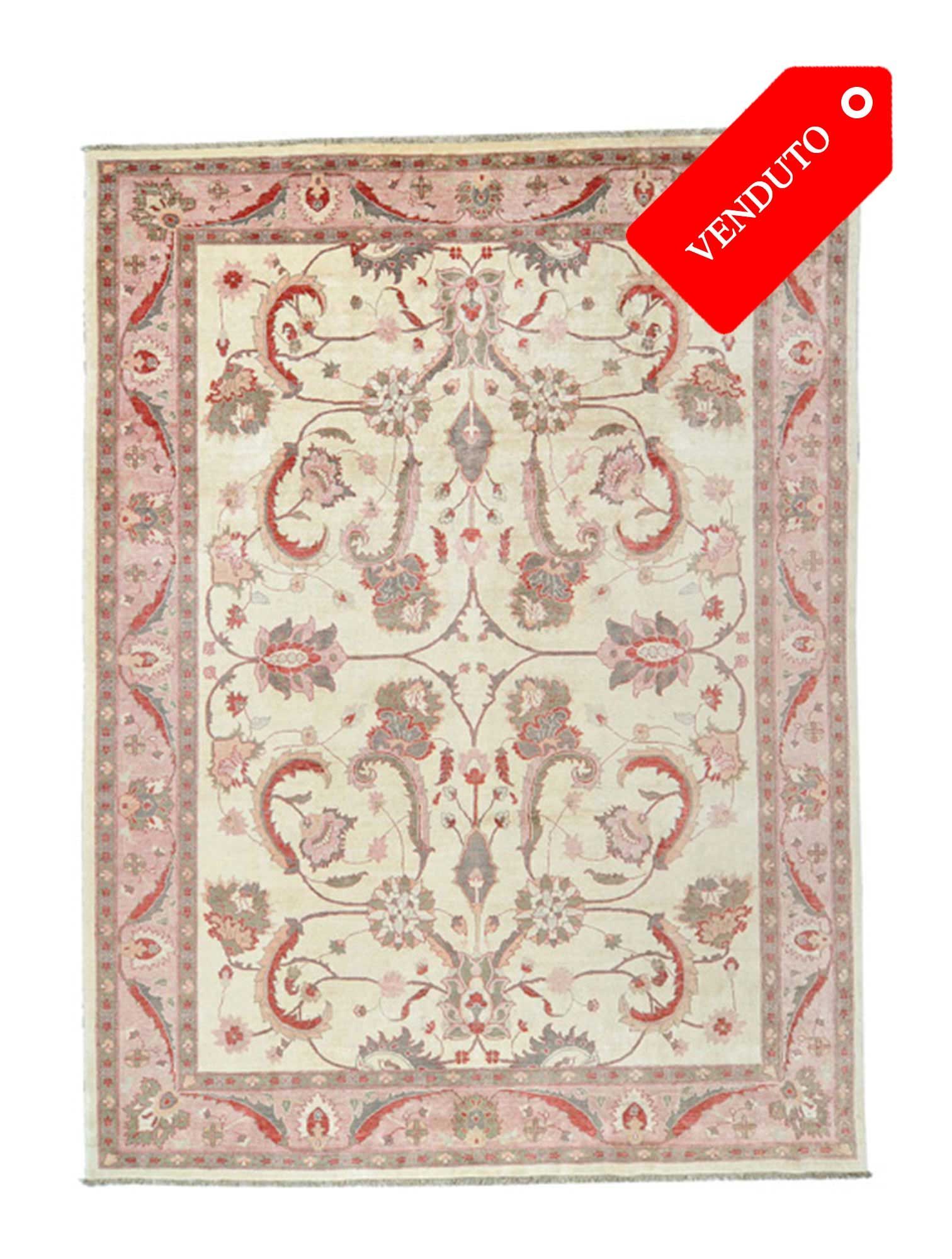 Tappeto annodato in Pakistan. L’origine di tale lavorazione affonda le sue radici nella persia dell’800. Le lane filate e le tinte utilizzate, conferiscono una particolare patina che ricorda manifatture di epoche passate.